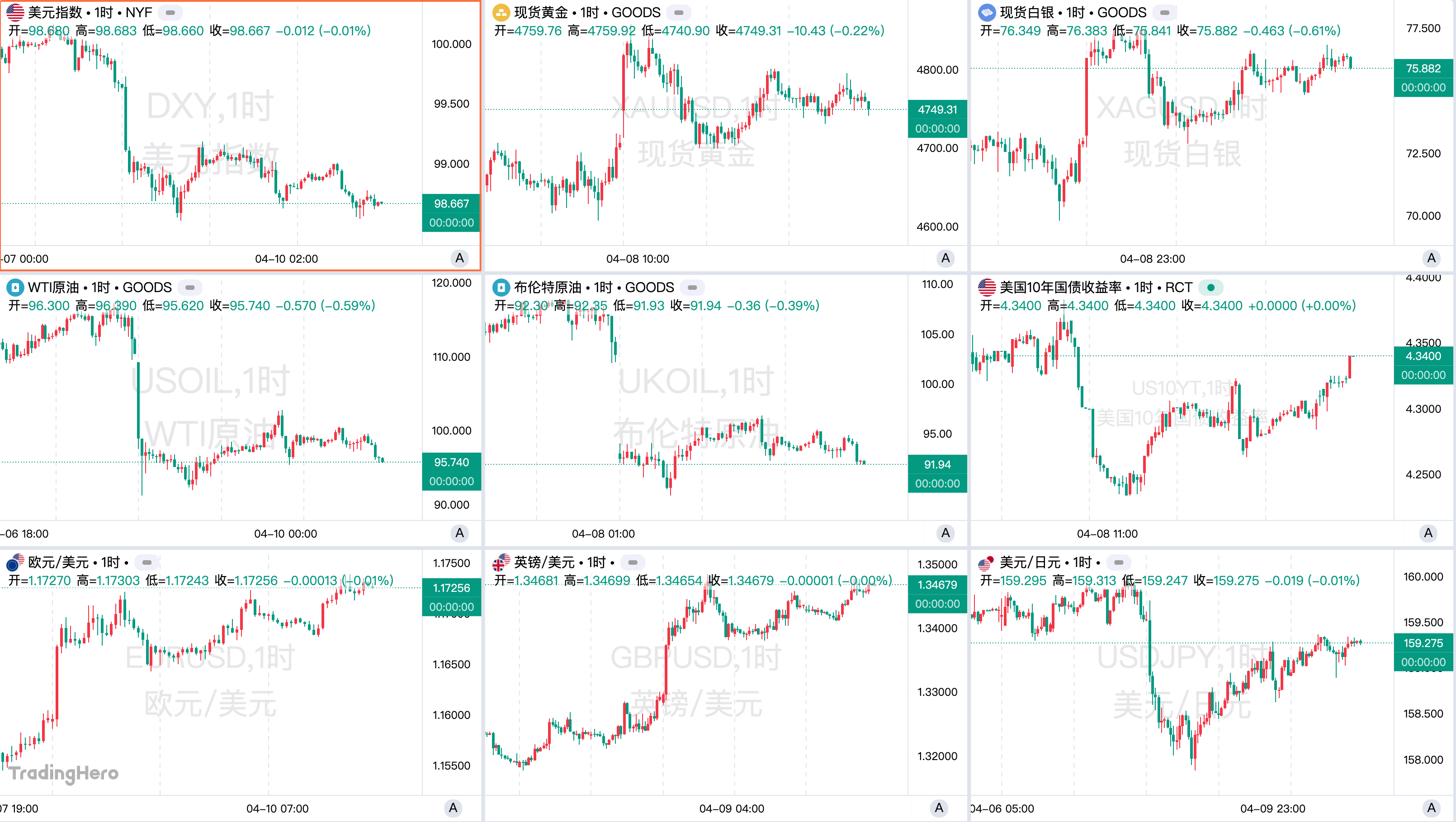 美元指数本周整体走弱,跌破100关口后持续承压,周五收于98.67。周三在美伊停火预期推动下,美指触及阶段低点,随后进入震荡行情,整体下跌1.5%,录得1月中旬以来最大周跌幅。主线是中东停火后避险美元仓位集中回吐,3月因战争与油价飙升建立的多头被迅速平仓。